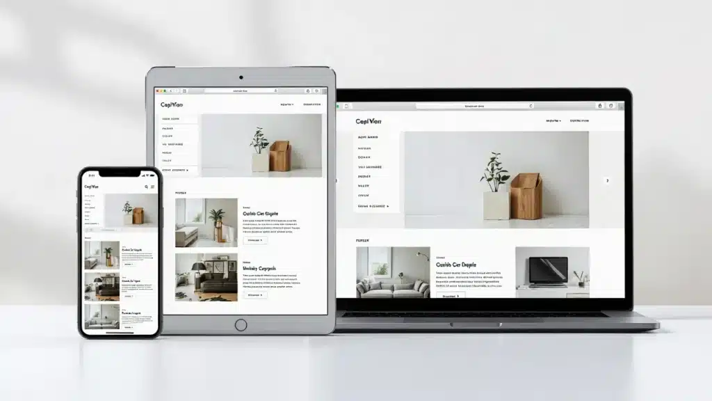 Демонстрация адаптивного дизайна — один и тот же сайт на экранах смартфона, планшета и ноутбука. Показывает, как контент перестраивается под разные размеры экранов.