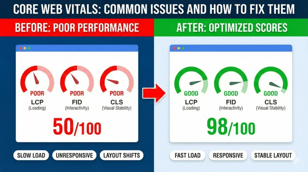 Классический до/после в стиле спидометров: слева «Poor» (красные зоны) по LCP, FID, CLS — справа «Good» (зелёные) после оптимизации. Общий скор вырос с 50/100 до 98/100. Идеально для демонстрации эффекта от сжатия изображений, lazy loading, удаления render-blocking JS и фикса layout shifts.